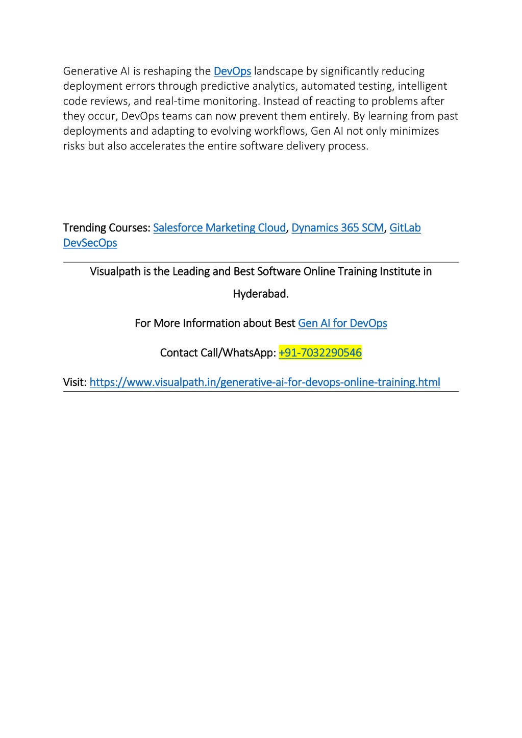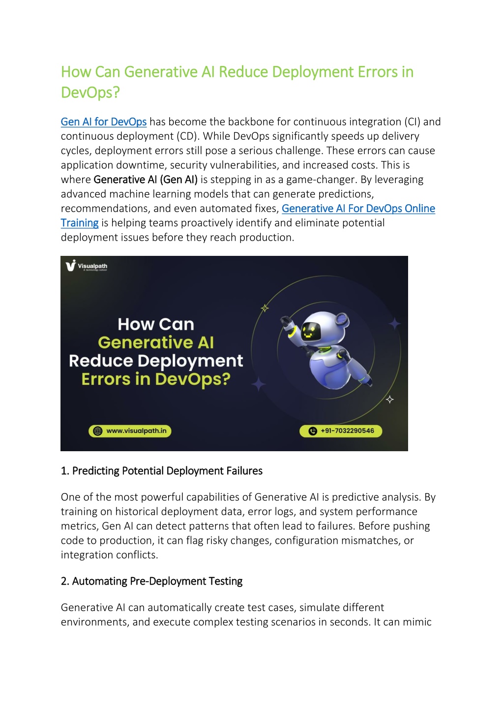 1. How Can Generative AI Reduce Deployment Errors in How Can Generative AI Reduce Deployment Errors in DevOps? DevOps? Gen AI for DevOps Gen AI for DevOps has become the backbone for continuous integration (CI) and continuous deployment (CD). While DevOps significantly speeds up delivery cycles, deployment errors still pose a serious challenge. These errors can cause application downtime, security vulnerabilities, and increased costs. This is where Generative AI (Gen AI) Generative AI (Gen AI) is stepping in as a game-changer. By leveraging advanced machine learning models that can generate predictions, recommendations, and even automated fixes, Generative AI For DevOps Online Training Training is helping teams proactively identify and eliminate potential deployment issues before they reach production. Generative AI For DevOps Online 1. Predicting Potential Deployment Failures 1. Predicting Potential Deployment Failures One of the most powerful capabilities of Generative AI is predictive analysis. By training on historical deployment data, error logs, and system performance metrics, Gen AI can detect patterns that often lead to failures. Before pushing code to production, it can flag risky changes, configuration mismatches, or integration conflicts. 2. Automating Pre 2. Automating Pre- -Deployment Testing Deployment Testing Generative AI can automatically create test cases, simulate different environments, and execute complex testing scenarios in seconds. It can mimic