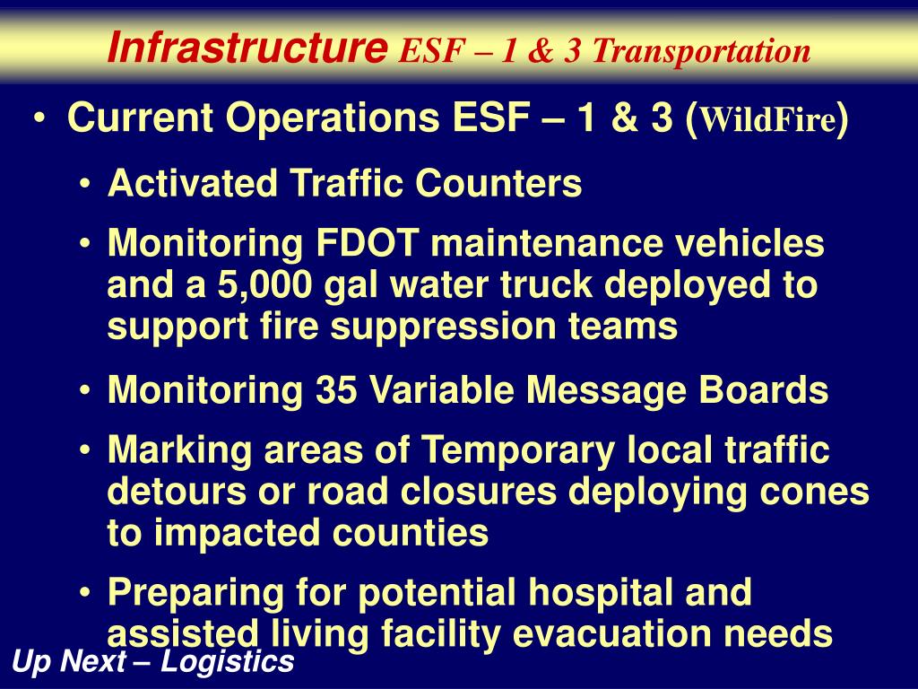 Infrastructure ESF – 1 & 3 Transportation • Current Operations ESF – 1 & 3 (WildFire) • Activated Traffic Counters • Monitoring FDOT maintenance vehicles and a 5,000 gal water truck deployed to support fire suppression teams • Monitoring 35 Variable Message Boards • Marking areas of Temporary local traffic detours or road closures deploying cones to impacted counties • Preparing for potential hospital and assisted living facility evacuation needs Up Next – Logistics
