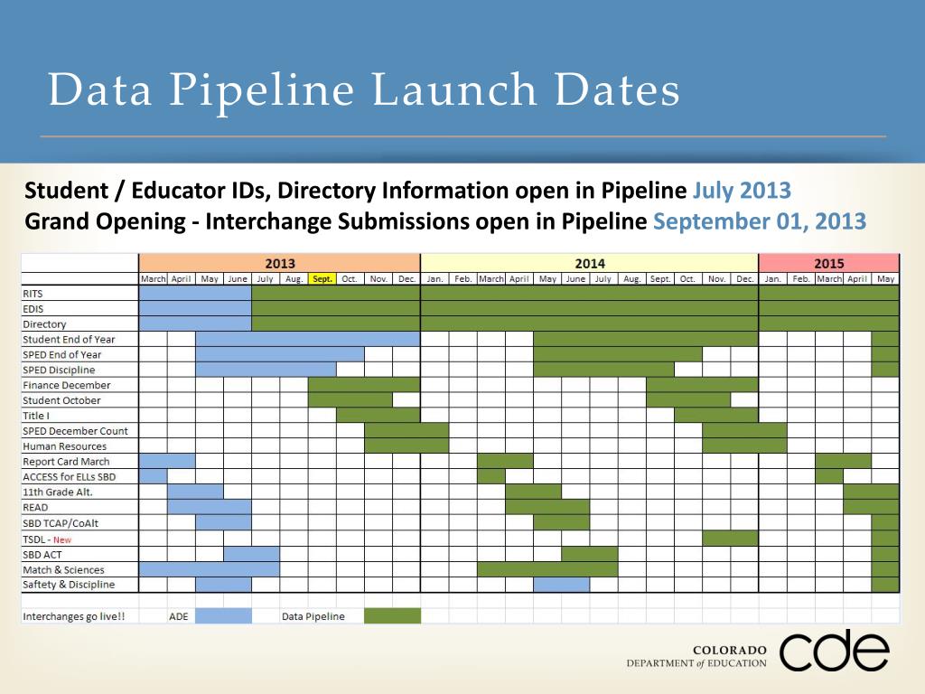 Data Pipeline Launch Dates Student / Educator IDs, Directory Information open in Pipeline July 2013 Grand Opening - Interchange Submissions open in Pipeline September 01, 2013