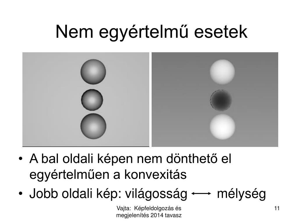 Nem egyértelmű esetek • A bal oldali képen nem dönthető el egyértelműen a konvexitás • Jobb oldali kép: világosság mélység Vajta: Képfeldolgozás és megjelenítés2014 tavasz