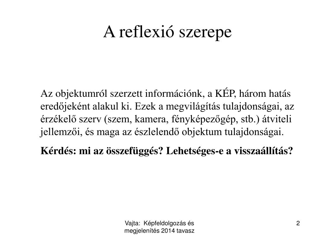 A reflexió szerepe Az objektumról szerzett információnk, a KÉP, három hatás eredőjeként alakul ki. Ezek a megvilágítás tulajdonságai, az érzékelő szerv (szem, kamera, fényképezőgép, stb.) átviteli jellemzői, és maga az észlelendő objektum tulajdonságai. Kérdés: mi az összefüggés? Lehetséges-e a visszaállítás? Vajta: Képfeldolgozás és megjelenítés2014 tavasz