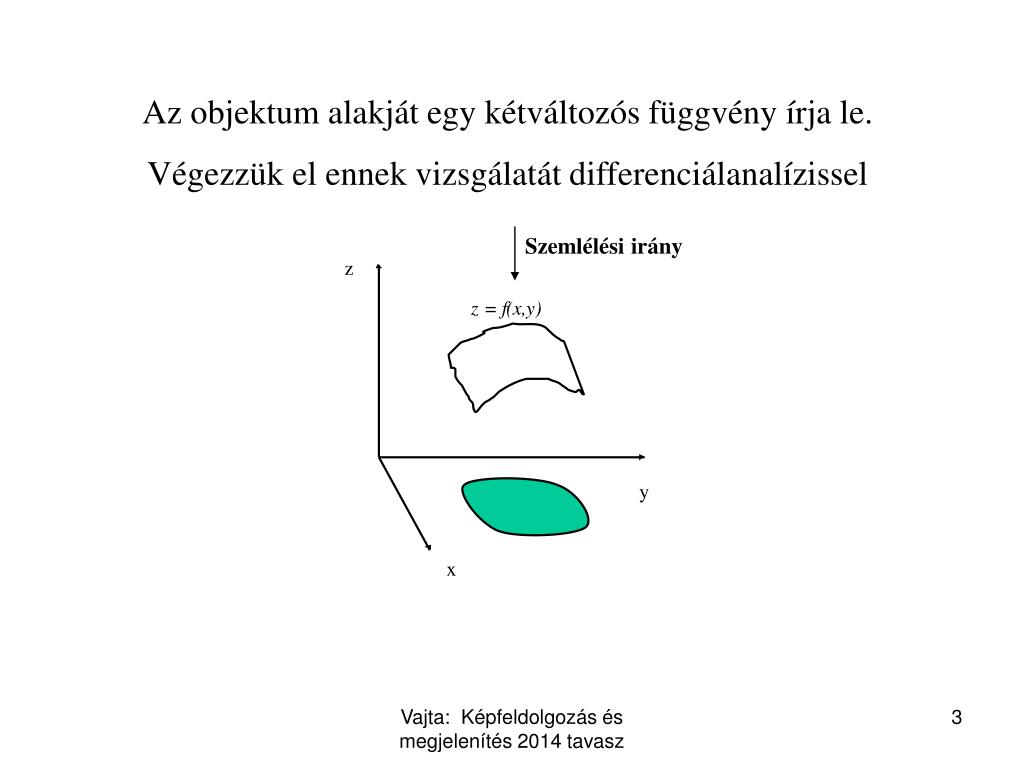 Az objektum alakját egy kétváltozós függvény írja le. Végezzük el ennek vizsgálatát differenciálanalízissel Szemlélési irány Vajta: Képfeldolgozás és megjelenítés2014 tavasz