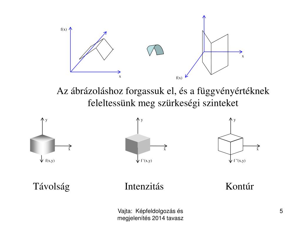 x f(x) f(x) x y y x x f(x,y) f '(x,y) y x f ''(x,y) Az ábrázoláshoz forgassuk el, és a függvényértéknek feleltessünk meg szürkeségi szinteket Távolság Intenzitás Kontúr Vajta: Képfeldolgozás és megjelenítés2014 tavasz