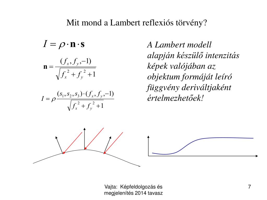 Mit mond a Lambert reflexiós törvény? A Lambert modell alapján készülő intenzitás képek valójában az objektum formáját leíró függvény deriváltjaként értelmezhetőek! Vajta: Képfeldolgozás és megjelenítés2014 tavasz