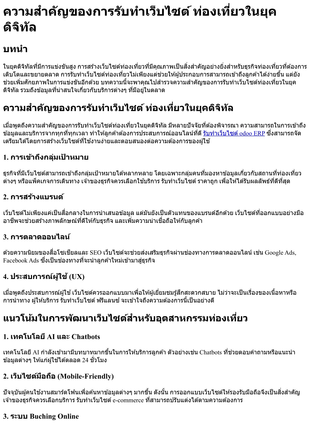 ความสําคัญของการรับทําเว็บไซต์ท่องเที?ยวในยุคความสําคัญของการรับทําเว็บไซต์ท่องเที?ยวในยุค ดิจิทัล บทนํา ในยุคดิจิทัลที?มีการแข่งขันสูงการสร้างเว็บไซต์ท่องเที?ยวที?มีคุณภาพเป็นสิ?งสําคัญอย่างยิ?งสําหรับธุรกิจท่องเที?ยวที?ต้องการ เติบโตและขยายตลาดการรับทําเว็บไซต์ท่องเที?ยวไม่เพียงแต่ช่วยให้ผู้ประกอบการสามารถเข้าถึงลูกค้าได้ง่ายขึ?นแต่ยัง ช่วยเพิ?มศักยภาพในการแข่งขันอีกด้วยบทความนี?จะพาคุณไปสํารวจความสําคัญของการรับทําเว็บไซต์ท่องเที?ยวในยุค ดิจิทัลรวมถึงข้อมูลที?น่าสนใจเกี?ยวกับบริการต่างๆที?มีอยู่ในตลาด ความสําคัญของการรับทําเว็บไซต์ท่องเที?ยวในยุคดิจิทัล เมื?อพูดถึงความสําคัญของการรับทําเว็บไซต์ท่องเที?ยวในยุคดิจิทัลมีหลายปัจจัยที?ต้องพิจารณาความสามารถในการเข้าถึง ข้อมูลและบริการจากทุกที?ทุกเวลาทําให้ลูกค้าต้องการประสบการณ์ออนไลน์ที?ดีรับทําเว็บไซต์ odoo ERPซึ?งสามารถจัด เตรียมได้โดยการสร้างเว็บไซต์ที?ใช้งานง่ายและตอบสนองต่อความต้องการของผู้ใช้ 1. การเข้าถึงกลุ่มเป ้ าหมาย ธุรกิจที?มีเว็บไซต์สามารถเข้าถึงกลุ่มเป้าหมายได้หลากหลายโดยเฉพาะกลุ่มคนที?มองหาข้อมูลเกี?ยวกับสถานที?ท่องเที?ยว ต่างๆหรือแพ็คเกจการเดินทางเจ้าของธุรกิจควรเลือกใช้บริการรับทําเว็บไซต์ราคาถูกเพื?อให้ได้รับผลลัพธ์ที?ดีที?สุด 2. การสร้างแบรนด์ เว็บไซต์ไม่เพียงแค่เป็นสื?อกลางในการนําเสนอข้อมูลแต่มันยังเป็นตัวแทนของแบรนด์อีกด้วยเว็บไซต์ที?ออกแบบอย่างมือ อาชีพจะช่วยสร้างภาพลักษณ์ที?ดีให้กับธุรกิจและเพิ?มความน่าเชื?อถือให้กับลูกค้า 3. การตลาดออนไลน์ ด้วยความนิยมของสื?อโซเชียลและ SEO เว็บไซต์จะช่วยส่งเสริมธุรกิจผ่านช่องทางการตลาดออนไลน์เช่น Google Ads, Facebook Ads ซึ?งเป็นช่องทางที?จะนําลูกค้าใหม่เข้ามาสู่ธุรกิจ 4. ประสบการณ์ผู้ใช้ (UX) เมื?อพูดถึงประสบการณ์ผู้ใช้เว็บไซต์ควรออกแบบมาเพื?อให้ผู้เยี?ยมชมรู้สึกสะดวกสบายไม่ว่าจะเป็นเรื?องของเนื?อหาหรือ การนําทางผู้ให้บริการรับทําเว็บไซต์ฟรีแลนซ์จะเข้าใจถึงความต้องการนี?เป็นอย่างดี แนวโน้มในการพัฒนาเว็บไซต์สําหรับอุตสาหกรรมท่องเที?ยว 1. เทคโนโลยี AI และ Chatbots เทคโนโลยี AI กําลังเข้ามามีบทบาทมากขึ?นในการให้บริการลูกค้าตัวอย่างเช่น Chatbots ที?ช่วยตอบคําถามหรือแนะนํา ข้อมูลต่างๆให้แก่ผู้ใช้ได้ตลอด 24 ชั?วโมง 2. เว็บไซต์มือถือ (Mobile-Friendly) ปัจจุบันผู้คนใช้งานสมาร์ตโฟนเพื?อค้นหาข้อมูลต่างๆมากขึ?นดังนั?นการออกแบบเว็บไซต์ให้รองรับมือถือจึงเป็นสิ?งสําคัญ เจ้าของธุรกิจควรเลือกบริการรับทํ