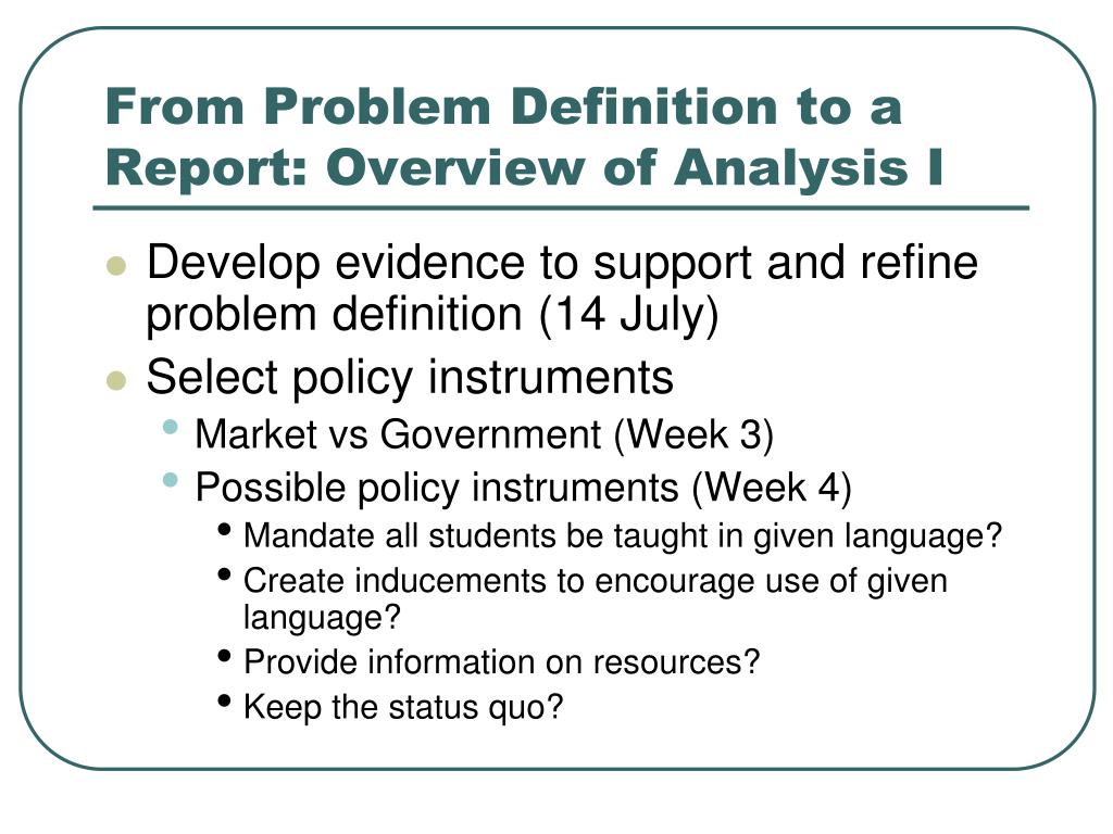 From Problem Definition to a Report: Overview of Analysis I • Develop evidence to support and refine problem definition (14 July) • Select policy instruments • Market vs Government (Week 3) • Possible policy instruments (Week 4) • Mandate all students be taught in given language? • Create inducements to encourage use of given language? • Provide information on resources? • Keep the status quo?