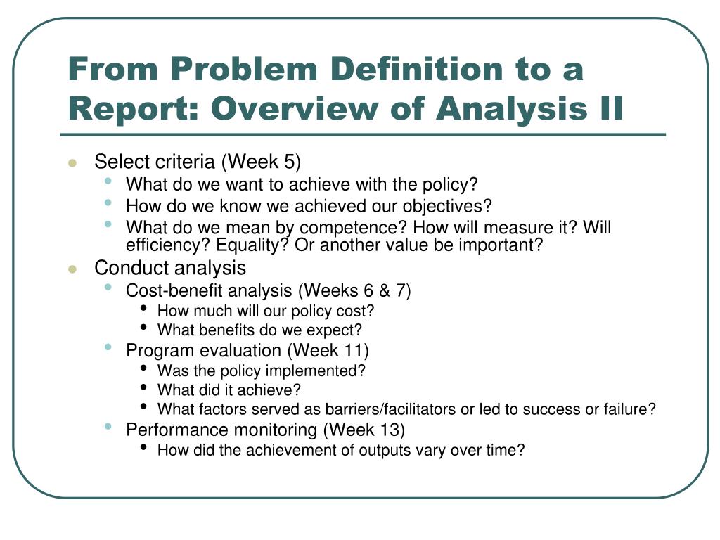 From Problem Definition to a Report: Overview of Analysis II • Select criteria (Week 5) • What do we want to achieve with the policy? • How do we know we achieved our objectives? • What do we mean by competence? How will measure it? Will efficiency? Equality? Or another value be important? • Conduct analysis • Cost-benefit analysis (Weeks 6 & 7) • How much will our policy cost? • What benefits do we expect? • Program evaluation (Week 11) • Was the policy implemented? • What did it achieve? • What factors served as barriers/facilitators or led to success or failure? • Performance monitoring (Week 13) • How did the achievement of outputs vary over time?