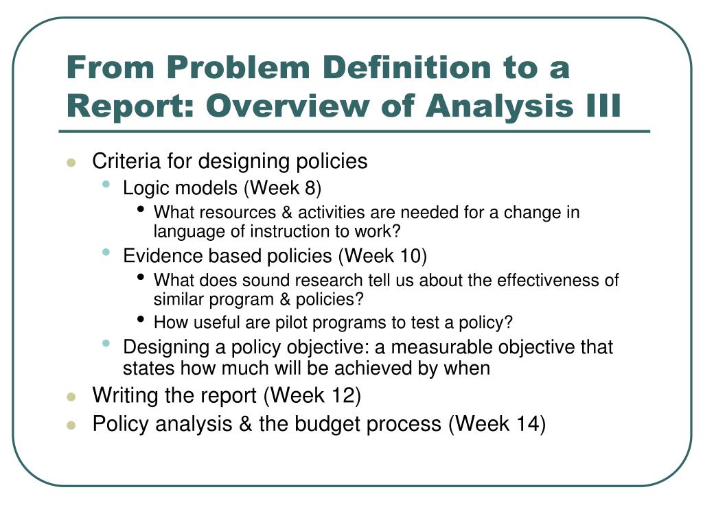 From Problem Definition to a Report: Overview of Analysis III • Criteria for designing policies • Logic models (Week 8) • What resources & activities are needed for a change in language of instruction to work? • Evidence based policies (Week 10) • What does sound research tell us about the effectiveness of similar program & policies? • How useful are pilot programs to test a policy? • Designing a policy objective: a measurable objective that states how much will be achieved by when • Writing the report (Week 12) • Policy analysis & the budget process (Week 14)