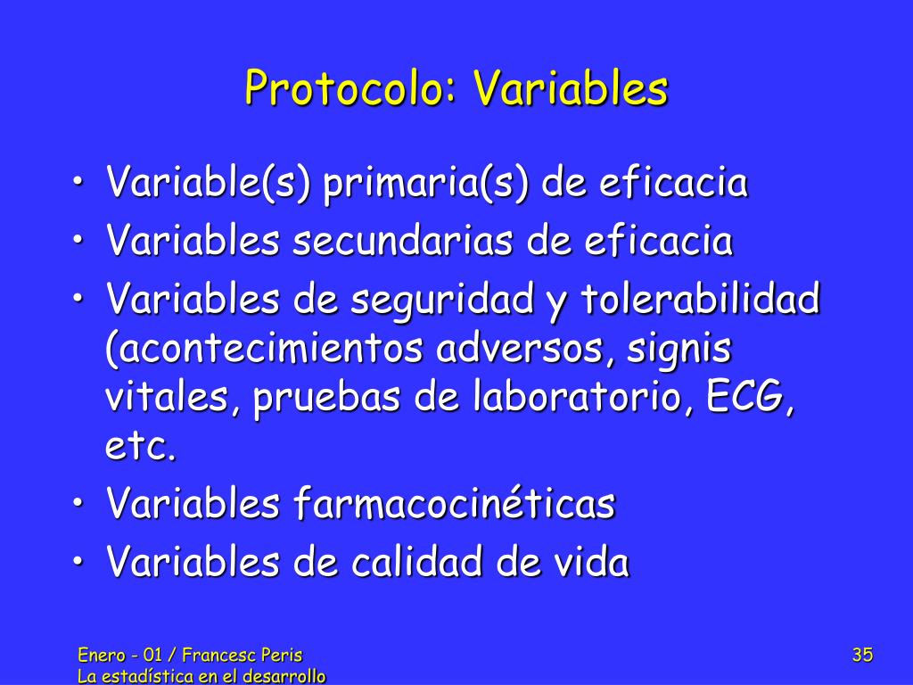 Protocolo: Variables • Variable(s) primaria(s) de eficacia • Variables secundarias de eficacia • Variables de seguridad y tolerabilidad (acontecimientos adversos, signis vitales, pruebas de laboratorio, ECG, etc. • Variables farmacocinéticas • Variables de calidad de vida Enero - 01 / Francesc Peris La estadística en el desarrollo de nuevos fármacos