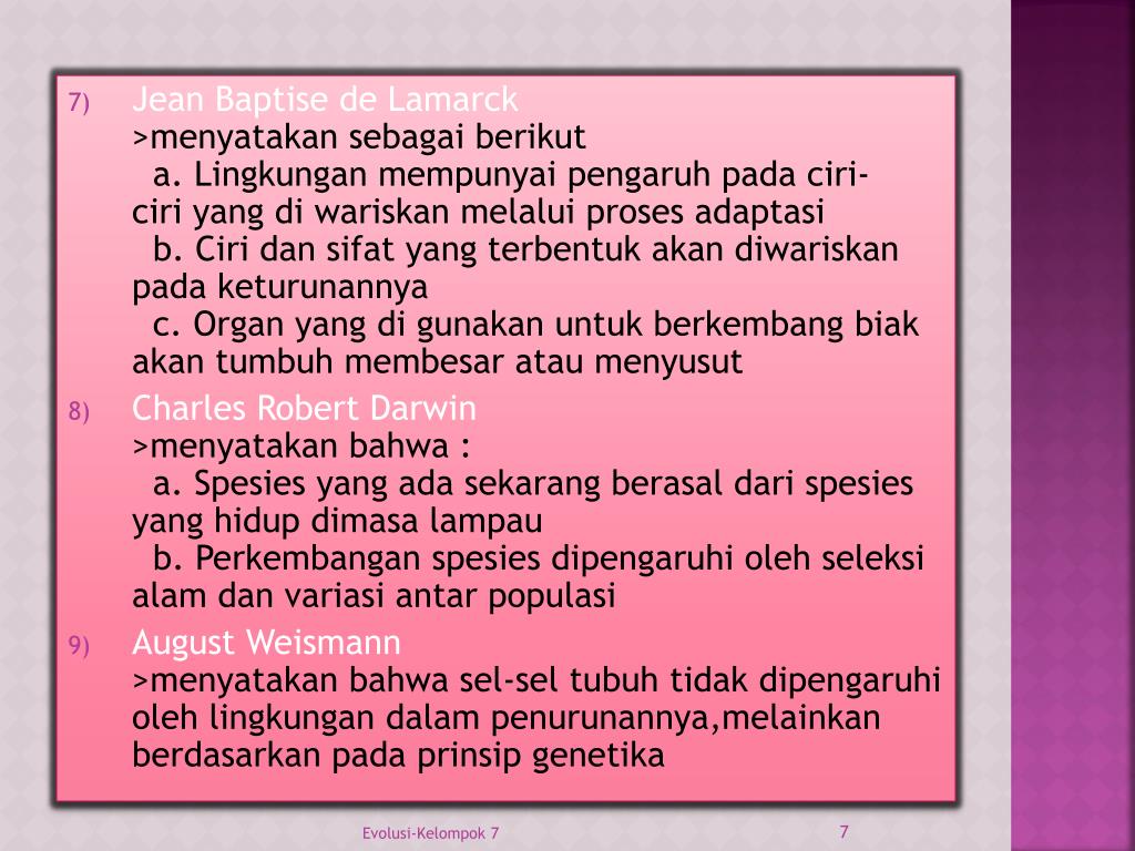 Jean Baptise de Lamarck>menyatakansebagaiberikut a. Lingkunganmempunyaipengaruhpadaciri- ciri yang diwariskanmelaluiprosesadaptasi b. Ciridansifat yang terbentukakandiwariskanpadaketurunannya c. Organ yang digunakanuntukberkembangbiakakantumbuhmembesarataumenyusut • Charles Robert Darwin>menyatakanbahwa : a. Spesies yang adasekarangberasaldarispesies yang hidupdimasalampau b. Perkembanganspesiesdipengaruhiolehseleksialamdanvariasiantarpopulasi • August Weismann>menyatakanbahwasel-seltubuhtidakdipengaruhiolehlingkungandalampenurunannya,melainkanberdasarkanpadaprinsipgenetika Evolusi-Kelompok 7