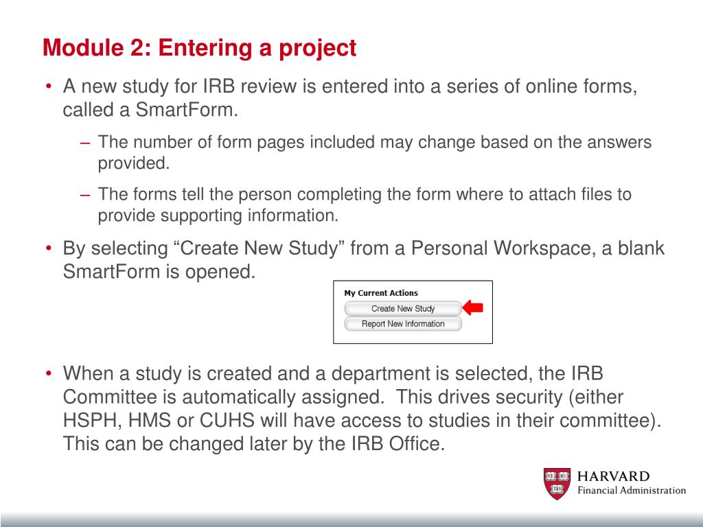Module 2: Entering a project • A new study for IRB review is entered into a series of online forms, called a SmartForm. • The number of form pages included may change based on the answers provided. • The forms tell the person completing the form where to attach files to provide supporting information. • By selecting “Create New Study” from a Personal Workspace, a blank SmartForm is opened. • When a study is created and a department is selected, the IRB Committee is automatically assigned. This drives security (either HSPH, HMS or CUHS will have access to studies in their committee). This can be changed later by the IRB Office.