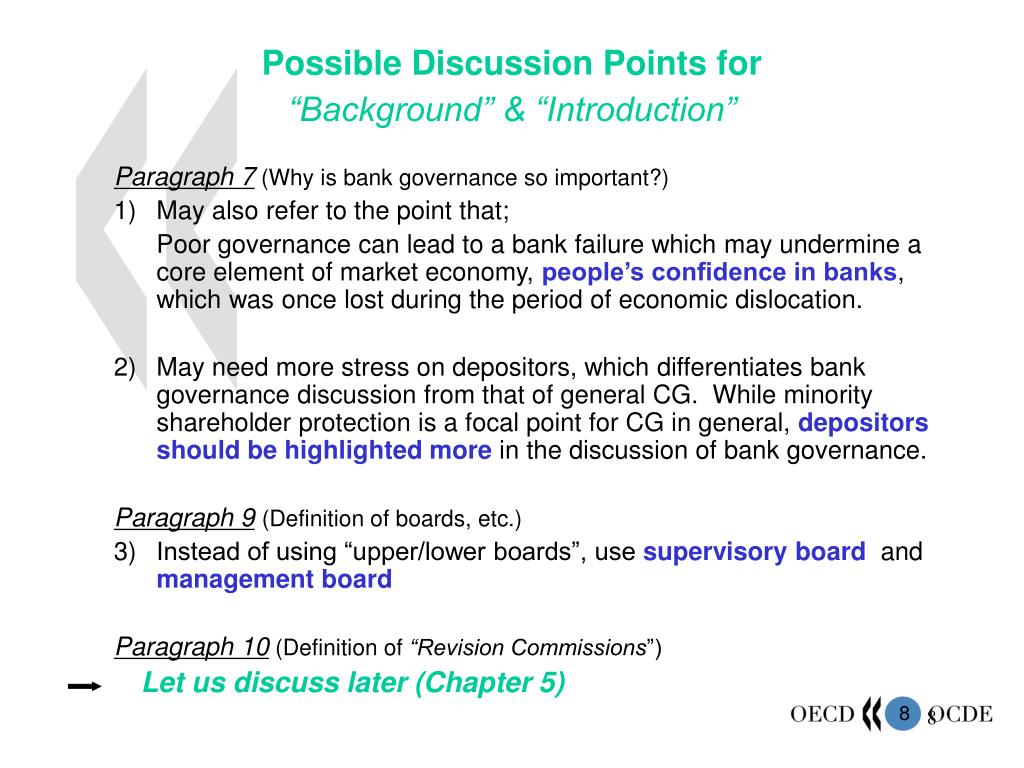 Possible Discussion Points for“Background” & “Introduction” Paragraph 7 (Why is bank governance so important?) • May also refer to the point that; Poor governance can lead to a bank failurewhich may undermine a core element of market economy, people’s confidence in banks, which was once lost during the period of economic dislocation. • May need more stress on depositors, which differentiates bank governance discussion from that of general CG. While minority shareholder protection is a focal point for CG in general, depositors should be highlighted morein the discussion of bank governance. Paragraph 9(Definition of boards, etc.) • Instead of using “upper/lower boards”, use supervisory board and management board Paragraph 10 (Definition of “Revision Commissions”) Let us discuss later (Chapter 5)