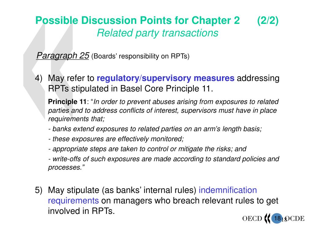 Possible Discussion Points forChapter2 (2/2)Related party transactions Paragraph 25(Boards’ responsibility on RPTs) • May refer to regulatory/supervisory measures addressing RPTs stipulated in Basel Core Principle 11. Principle 11: “In order to prevent abuses arising from exposures to related parties and to address conflicts of interest, supervisors must have in place requirements that; - banks extend exposures to related parties on an arm’s length basis; - these exposures are effectively monitored; - appropriate steps are taken to control or mitigate the risks; and - write-offs of such exposures are made according to standard policies and processes.” • May stipulate (as banks’ internal rules) indemnification requirements on managers who breach relevant rules to get involved in RPTs.