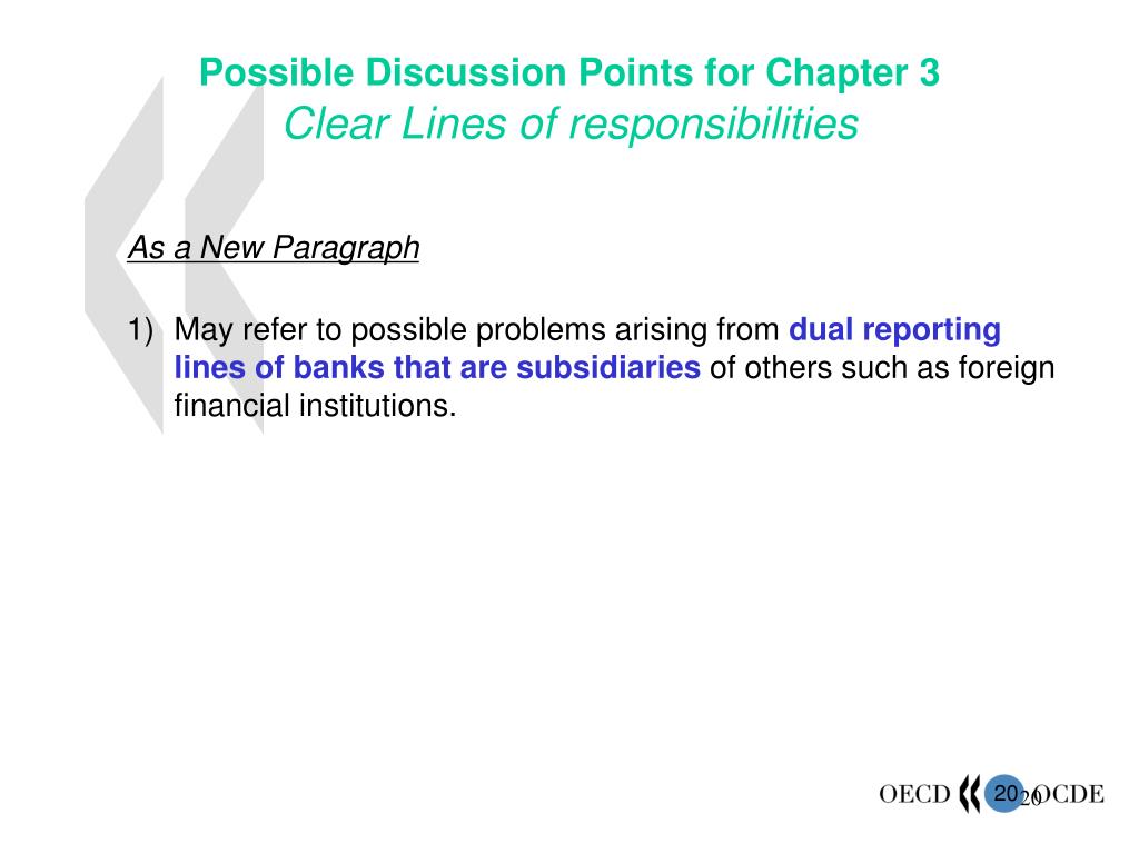 Possible Discussion Points forChapter3Clear Lines of responsibilities As a New Paragraph • May refer to possible problems arising from dual reporting lines of banks that are subsidiaries of others such as foreign financial institutions.