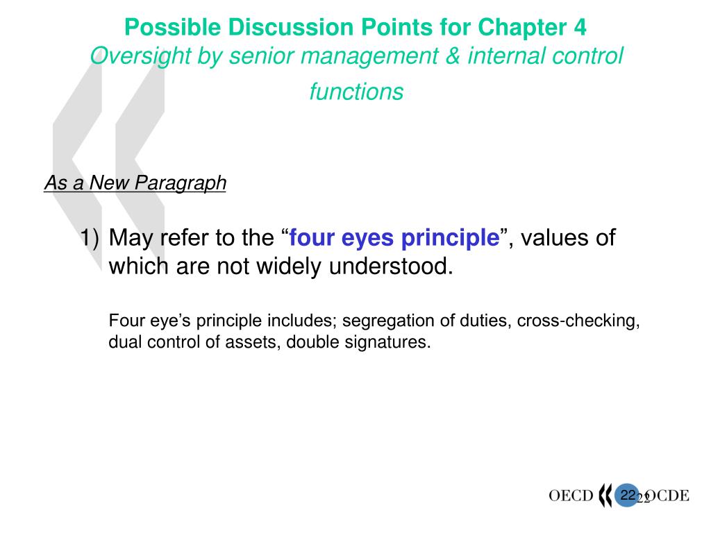 Possible Discussion Points forChapter4Oversight by senior management & internal control functions As a New Paragraph • May refer to the “four eyes principle”, values of which are not widely understood. Four eye’s principle includes; segregation of duties, cross-checking, dual control of assets, double signatures.