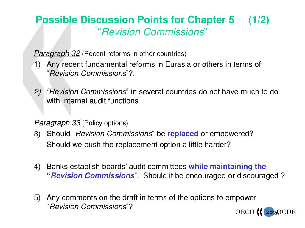 Possible Discussion Points forChapter5 (1/2)“Revision Commissions” Paragraph 32(Recent reforms in other countries) • Any recent fundamental reforms in Eurasia or others in terms of “Revision Commissions”?. • “Revision Commissions” in several countries do not have much to do with internal audit functions Paragraph 33 (Policy options) • Should “Revision Commissions” be replaced or empowered? Should we push the replacement option a little harder? • Banks establish boards’ audit committees while maintaining the “Revision Commissions”. Should it be encouraged or discouraged ? • Any comments on the draft in terms of the options to empower “Revision Commissions”?