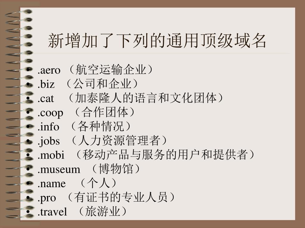 新增加了下列的通用顶级域名 • .aero (航空运输企业) • .biz (公司和企业) • .cat (加泰隆人的语言和文化团体) • .coop (合作团体) • .info (各种情况) • .jobs (人力资源管理者) • .mobi (移动产品与服务的用户和提供者) • .museum (博物馆) • .name (个人) • .pro (有证书的专业人员) • .travel (旅游业)