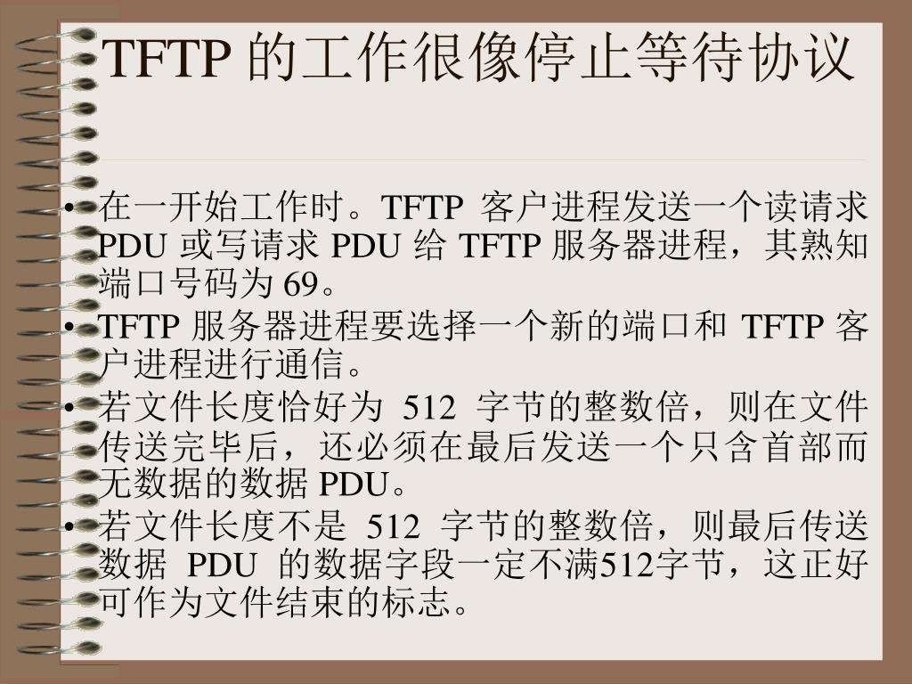 TFTP 的工作很像停止等待协议 • 在一开始工作时。TFTP 客户进程发送一个读请求 PDU 或写请求 PDU 给 TFTP 服务器进程,其熟知端口号码为 69。 • TFTP服务器进程要选择一个新的端口和TFTP客户进程进行通信。 • 若文件长度恰好为 512 字节的整数倍,则在文件传送完毕后,还必须在最后发送一个只含首部而无数据的数据 PDU。 • 若文件长度不是 512 字节的整数倍,则最后传送数据 PDU 的数据字段一定不满512字节,这正好可作为文件结束的标志。