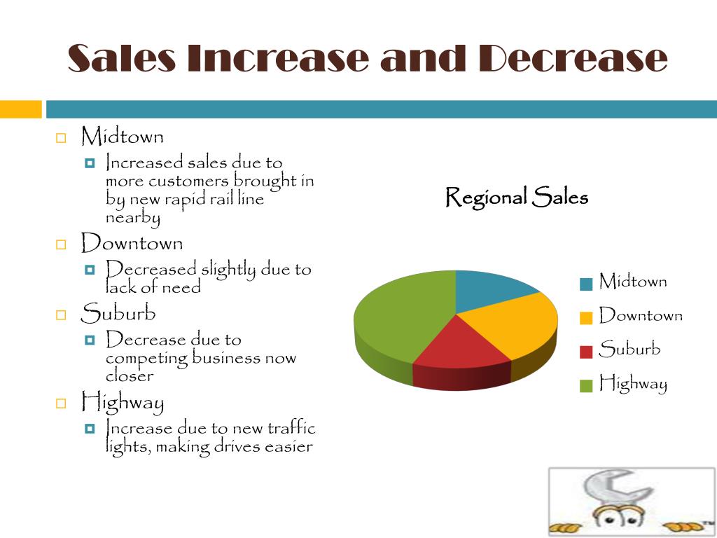 Sales Increase and Decrease • Midtown • Increased sales due to more customers brought in by new rapid rail line nearby • Downtown • Decreased slightly due to lack of need • Suburb • Decrease due to competing business now closer • Highway • Increase due to new traffic lights, making drives easier