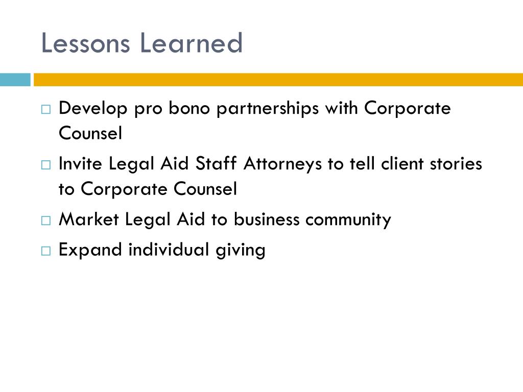 Lessons Learned • Develop pro bono partnerships with Corporate Counsel • Invite Legal Aid Staff Attorneys to tell client stories to Corporate Counsel • Market Legal Aid to business community • Expand individual giving