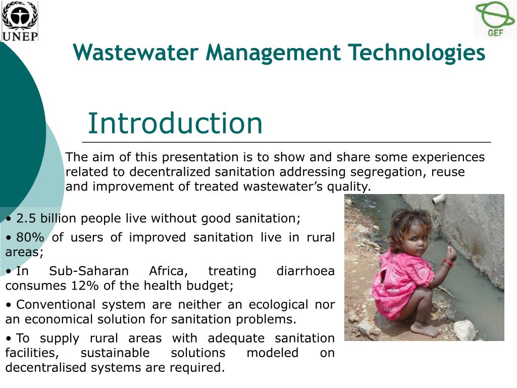 Wastewater Management Technologies Introduction The aim of this presentation is to show and share some experiences related to decentralized sanitation addressing segregation, reuse and improvement of treated wastewater’s quality. • 2.5 billion people live without good sanitation; • 80% of users of improved sanitation live in rural areas; • In Sub-Saharan Africa, treating diarrhoea consumes 12% of the health budget; • Conventional system are neither an ecological nor an economical solution for sanitation problems. • To supply rural areas with adequate sanitation facilities, sustainable solutions modeled on decentralised systems are required.