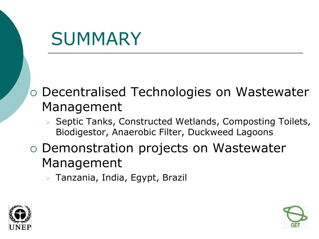 SUMMARY • Decentralised Technologies on Wastewater Management • Septic Tanks, Constructed Wetlands, Composting Toilets, Biodigestor, Anaerobic Filter, Duckweed Lagoons • Demonstration projects on Wastewater Management • Tanzania, India, Egypt, Brazil