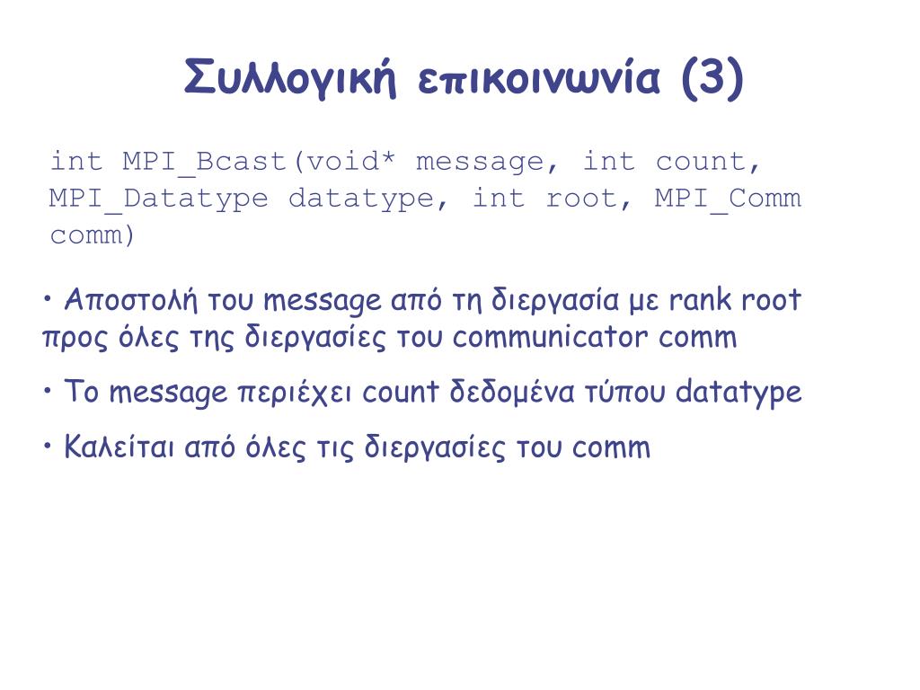 Συλλογική επικοινωνία (3) int MPI_Bcast(void* message, int count, MPI_Datatype datatype, int root, MPI_Comm comm) • Αποστολή του message από τη διεργασία με rank root προς όλες της διεργασίες του communicator comm • To message περιέχει count δεδομένα τύπου datatype • Καλείται από όλες τις διεργασίες του comm