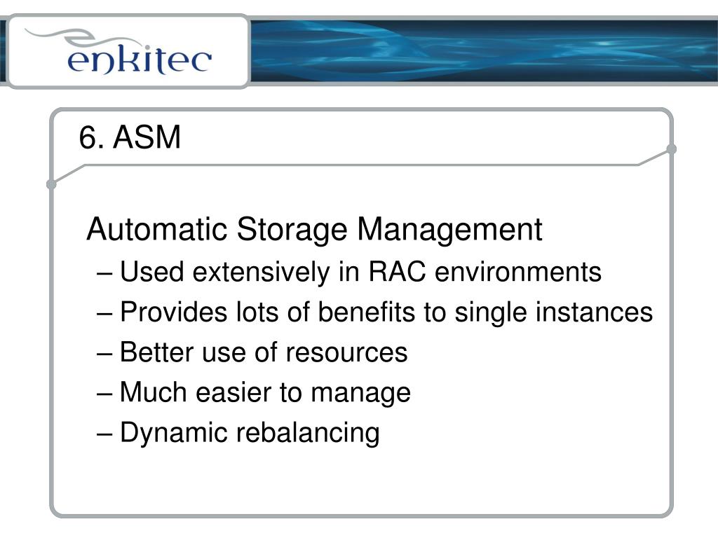 6. ASM Automatic Storage Management Used extensively in RAC environments Provides lots of benefits to single instances Better use of resources Much easier to manage Dynamic rebalancing