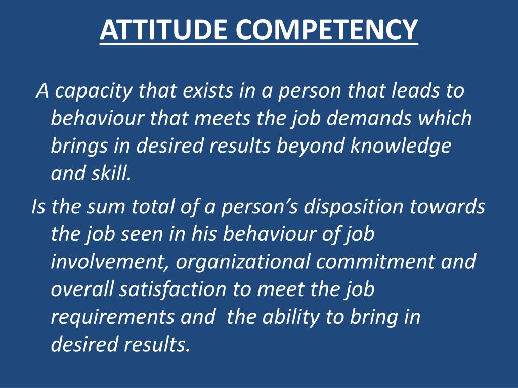 ATTITUDE COMPETENCY A capacity that exists in a person that leads to behaviour that meets the job demands which brings in desired results beyond knowledge and skill. Is the sum total of a person’s disposition towards the job seen in his behaviour of job involvement, organizational commitment and overall satisfaction to meet the job requirements and the ability to bring in desired results.
