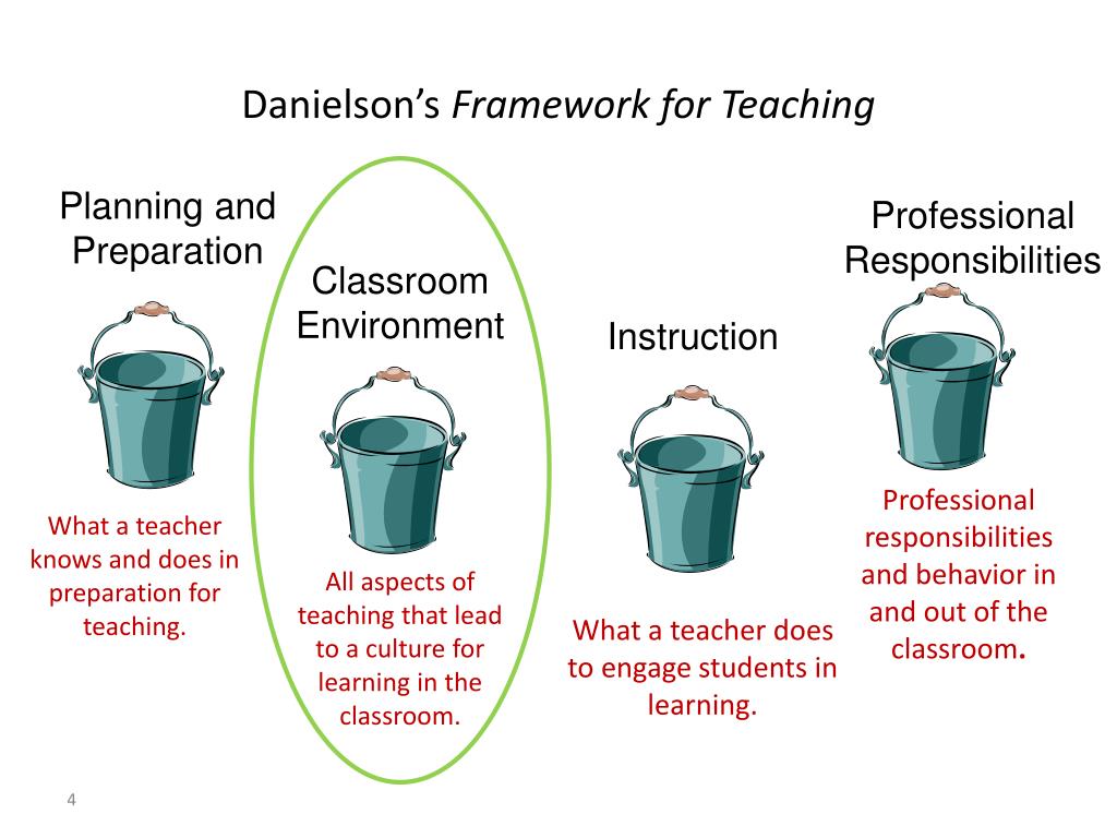 Danielson’s Framework for Teaching Planning and Preparation Professional Responsibilities Classroom Environment Instruction Professional responsibilities and behavior in and out of the classroom. What a teacher knows and does in preparation for teaching. All aspects of teaching that lead to a culture for learning in the classroom. What a teacher does to engage students in learning. 4