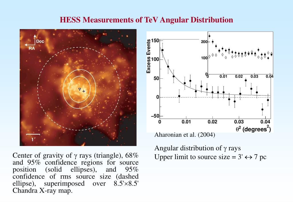 HESS Measurements of TeV Angular Distribution Center of gravity of g rays (triangle), 68% and 95% confidence regions for source position (solid ellipses), and 95% confidence of rms source size (dashed ellipse), superimposed over 8.5'8.5' Chandra X-ray map. Aharonian et al. (2004) Angular distribution of g rays Upper limit to source size = 3' 7 pc