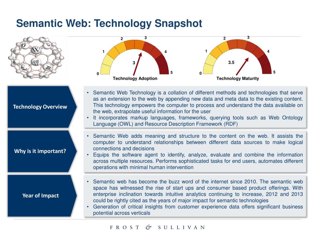 Semantic Web: Technology Snapshot 3 3 2 2 1 4 1 4 3.5 3 5 5 0 0 Technology Adoption Technology Maturity Technology Overview • Semantic Web Technology is a collation of different methods and technologies that serve as an extension to the web by appending new data and meta data to the existing content. This technology empowers the computer to process and understand the data available on the web, extrapolate useful information for the user • It incorporates markup languages, frameworks, querying tools such as Web Ontology Language (OWL) and Resource Description Framework (RDF) Why is it important? • Semantic Web adds meaning and structure to the content on the web. It assists the computer to understand relationships between different data sources to make logical connections and decisions • Equips the software agent to identify, analyze, evaluate and combine the information across multiple resources. Performs sophisticated tasks for end users, automates different operations with minimal human intervention Year of Impact • Semantic web has become the buzz word of the internet since 2010. The semantic web space has witnessed the rise of start ups and consumer based product offerings. With enterprise inclination towards intuitive analytics continuing to increase, 2012 and 2013 could be rightly cited as the years of major impact for semantic technologies • Generation of critical insights from customer experience data offers significant business potential across verticals