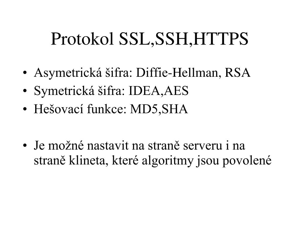 Protokol SSL,SSH,HTTPS • Asymetrická šifra: Diffie-Hellman, RSA • Symetrická šifra: IDEA,AES • Hešovací funkce: MD5,SHA • Je možné nastavit na straně serveru i na straně klineta, které algoritmy jsou povolené