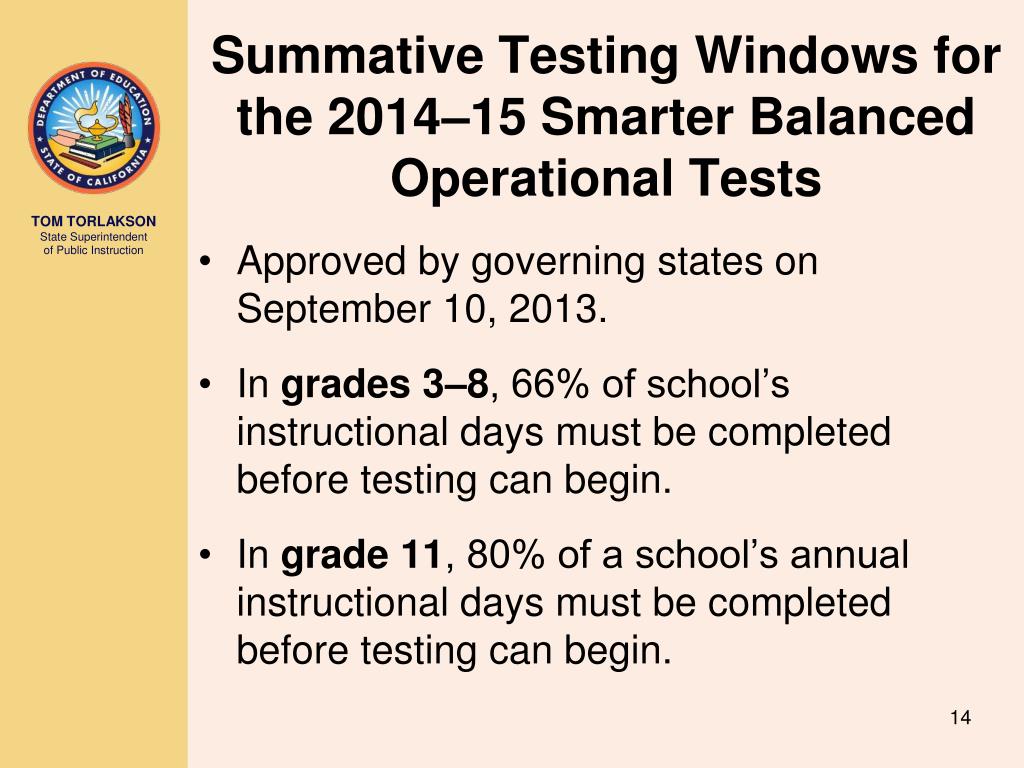 Summative Testing Windows for the 2014–15 Smarter Balanced Operational Tests • Approved by governing states on September 10, 2013. • In grades 3–8, 66% of school’s instructional days must be completed before testing can begin. • In grade 11, 80% of a school’s annual instructional days must be completed before testing can begin.