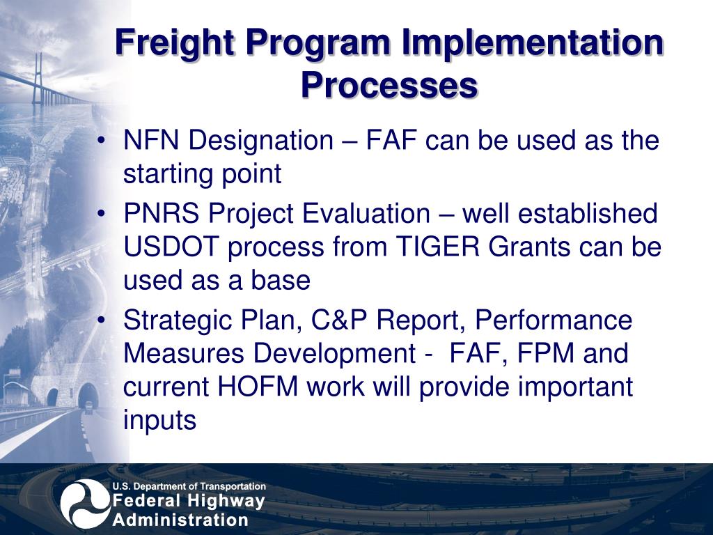 Freight Program Implementation Processes • NFN Designation – FAF can be used as the starting point • PNRS Project Evaluation – well established USDOT process from TIGER Grants can be used as a base • Strategic Plan, C&P Report, Performance Measures Development - FAF, FPM and current HOFM work will provide important inputs