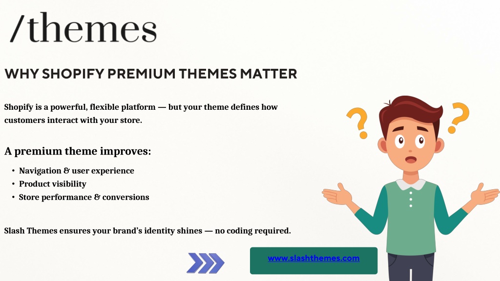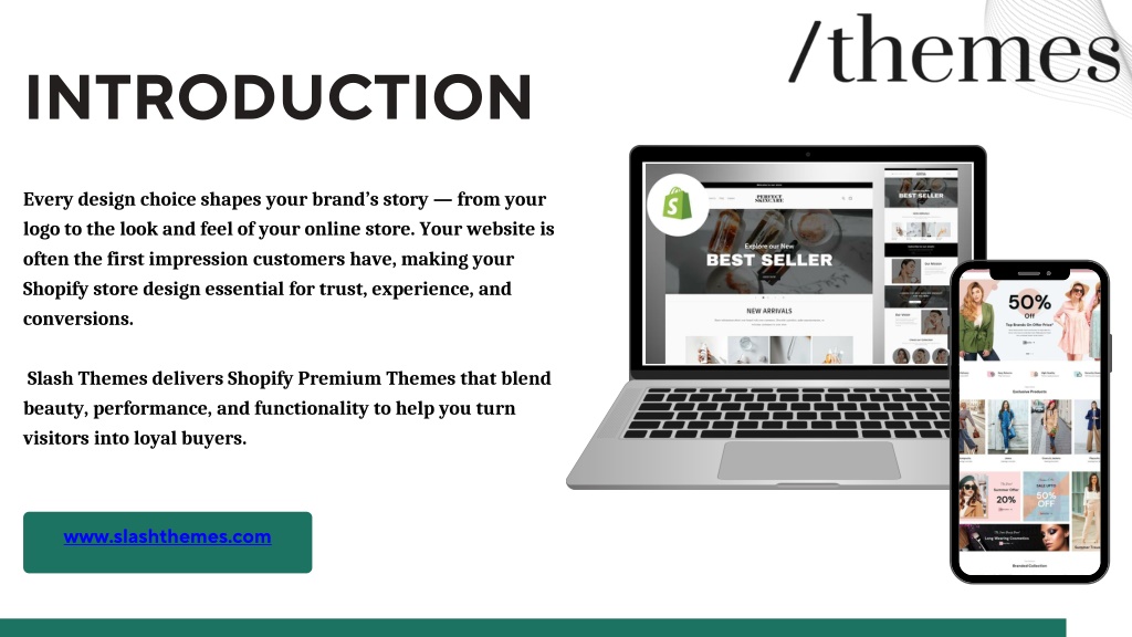 www.slashthemes.com WHY SHOPIFY PREMIUM THEMES MATTER Shopify is a powerful, flexible platform — but your theme defines how customers interact with your store. A premium theme improves: • Navigation & user experience • Product visibility • Store performance & conversions Slash Themes ensures your brand’s identity shines — no coding required.
