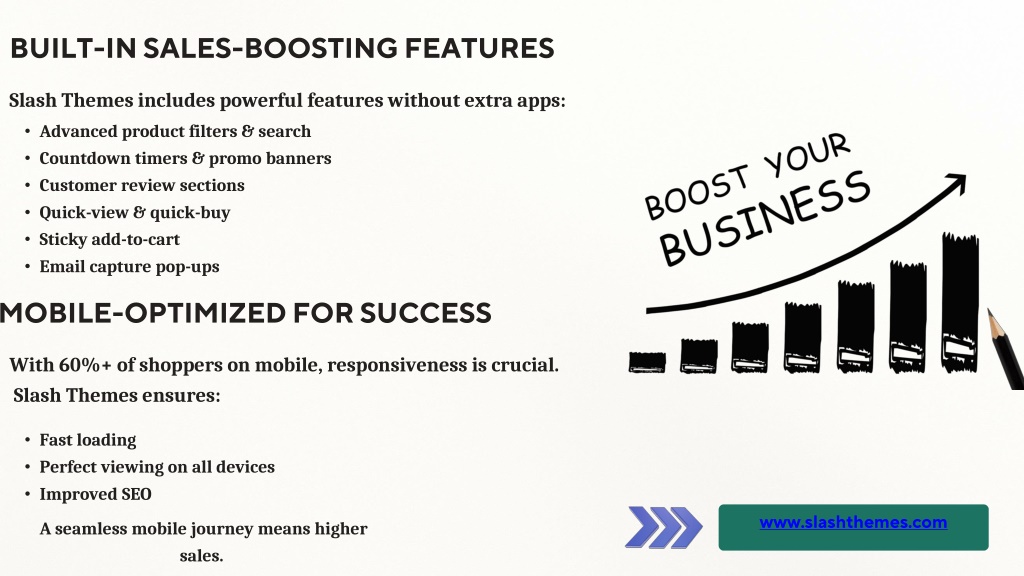 www.slashthemes.com BUILT-IN SALES-BOOSTING FEATURES Slash Themes includes powerful features without extra apps: • Advanced product filters & search • Countdown timers & promo banners • Customer review sections • Quick-view & quick-buy • Sticky add-to-cart • Email capture pop-ups MOBILE-OPTIMIZED FOR SUCCESS With 60%+ of shoppers on mobile, responsiveness is crucial. Slash Themes ensures: • Fast loading • Perfect viewing on all devices • Improved SEO A seamless mobile journey means higher sales.