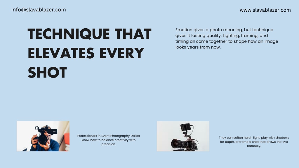 5. info@slavablazer.com www.slavablazer.com TECHNIQUE THAT ELEVATES EVERY SHOT Emotion gives a photo meaning, but technique gives it lasting quality. Lighting, framing, and timing all come together to shape how an image looks years from now. Professionals in Event Photography Dallas know how to balance creativity with precision. They can soften harsh light, play with shadows for depth, or frame a shot that draws the eye naturally.
