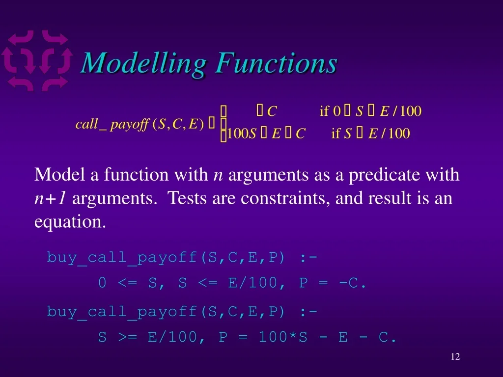 Modelling Functions Model a function with n arguments as a predicate with n+1 arguments. Tests are constraints, and result is an equation. buy_call_payoff(S,C,E,P) :- 0 <= S, S <= E/100, P = -C. buy_call_payoff(S,C,E,P) :- S >= E/100, P = 100*S - E - C.