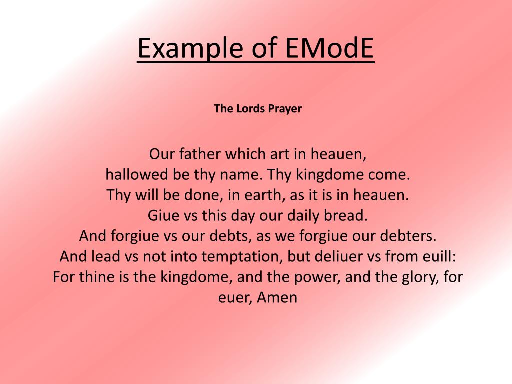 Example of EModE TheLordsPrayer Our father which art in heauen, hallowed be thy name. Thy kingdome come. Thy will be done, in earth, as it is in heauen. Giuevs this day our daily bread. And forgiuevs our debts, as we forgiue our debters. And lead vs not into temptation, but deliuervs from euill: For thine is the kingdome, and the power, and the glory, for euer, Amen