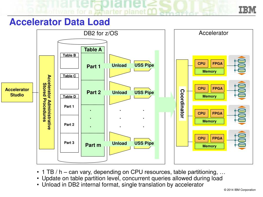 Accelerator Data Load Accelerator DB2 for z/OS Table A Table B Accelerator Administrative Stored Procedures CPU FPGA Part 1 USS Pipe Unload Memory Table C Accelerator Studio CPU FPGA Coordinator Part 2 Unload USS Pipe Table D Memory Part 1 . . . . . . . . . CPU FPGA Memory Part 2 CPU FPGA Part 3 USS Pipe Unload Part m Memory • 1 TB / h – can vary, depending on CPU resources, table partitioning, … • Update on table partition level, concurrent queries allowed during load • Unload in DB2 internal format, single translation by accelerator