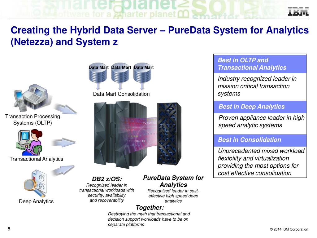 Creating the Hybrid Data Server – PureData System for Analytics (Netezza) and System z Best in OLTP and Transactional Analytics Industry recognized leader in mission critical transaction systems Data Mart Data Mart Data Mart Data Mart Consolidation Best in Deep Analytics Proven appliance leader in high speed analytic systems Transaction Processing Systems (OLTP) Best in Consolidation Unprecedented mixed workload flexibility and virtualization providing the most options for cost effective consolidation Transactional Analytics PureData System for Analytics Recognized leader in cost-effective high speed deep analytics DB2 z/OS: Recognized leader in transactional workloads with security, availability and recoverability Deep Analytics Together: Destroying the myth that transactional and decision support workloads have to be on separate platforms 8