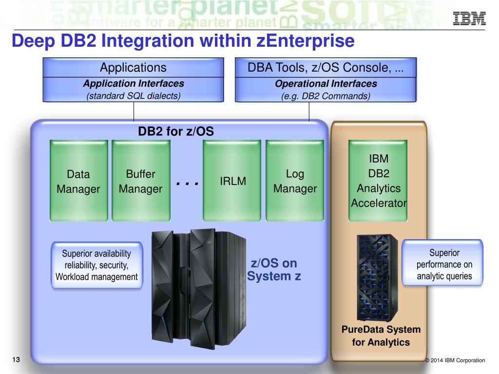Deep DB2 Integration within zEnterprise Applications DBA Tools, z/OS Console, ... Application Interfaces (standard SQL dialects) Operational Interfaces (e.g. DB2 Commands) DB2 for z/OS IBM DB2 Analytics Accelerator Log Manager IRLM Buffer Manager Data Manager . . . Superior performance on analytic queries Superior availability reliability, security, Workload management z/OS on System z PureData System for Analytics 13