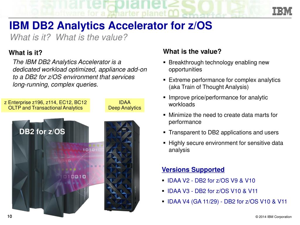 Fast • Complex queries run up to 2000x faster while retaining single record lookup speed • Cost Saving • Eliminate costly query tuning while offloading complex query processing • Appliance • No applications to change, just plug it in, load the data, and gain the value IBM DB2 Analytics Accelerator for z/OSBlending zEnterprise and Netezza technologies A high performance analytics accelerator appliance for IBM zEnterprise, delivering dramatically faster complex business analysis transparently to all users. 9 9
