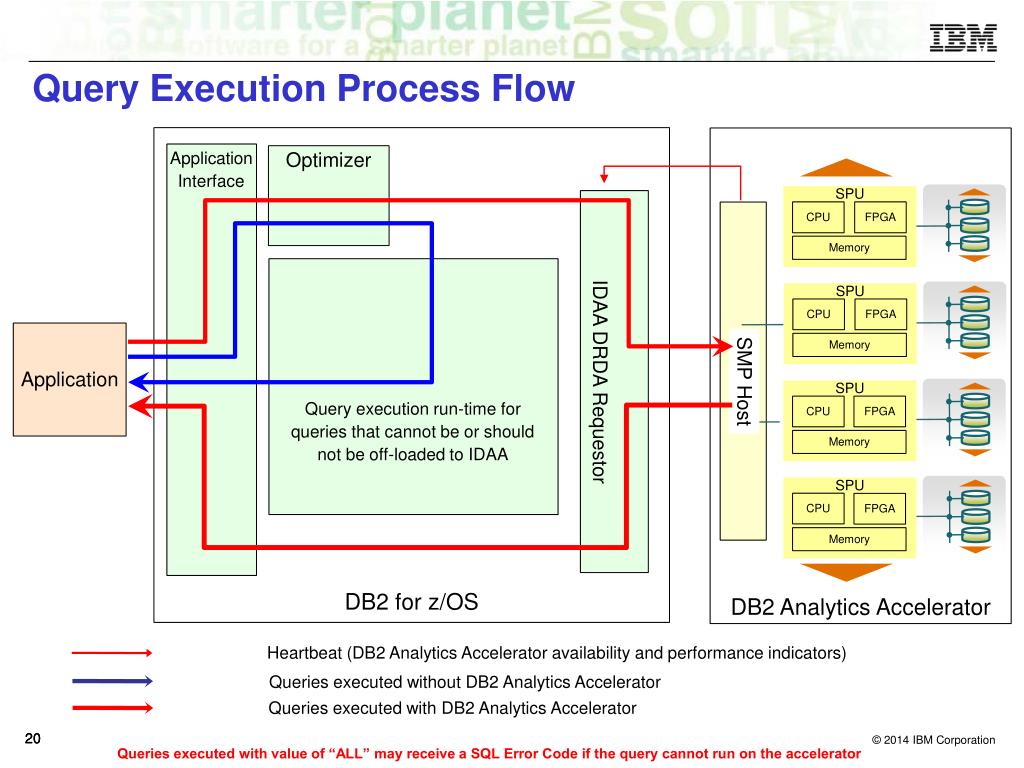 Query Off-load Applicability Accelerator is based on Netezza which supports rich set of SQL and data types BI tools such as Cognos has run on Netezza for years and will run on Accelerator as well Due to very large number of query types and SQL functions not all of them could be processed in V3. Key restrictions include: No static SQL (Lifted in V4) Not all DB2 functions, No Mathematical functions such as SIN, COS, TAN. No advanced string functions such as HEX, POSITION, LOCATE, LEFT, OVERLAY No advanced OLAP functions such as RANK, ROLLUP, CUBE No User Defined Functions No correlated table expressions or recursive correlated table expressions No correlated subquery in the SELECT list Not UTF-16 and MIXED/DBCS EBCDIC No multiple encoding schemes in the same statement (fixed in V4) Not all DB2 special registers: CURRENT PATH, SERVER, SQLID, SCHEMA, APPLICATION ENCODING SCHEME Not all DB2 data types: LOBs, ROWID, XML, DECFLOAT, BINARY None of these restrictions is a design problem, IBM plans to lift them in future releases based on customer feedback and needs 19 19