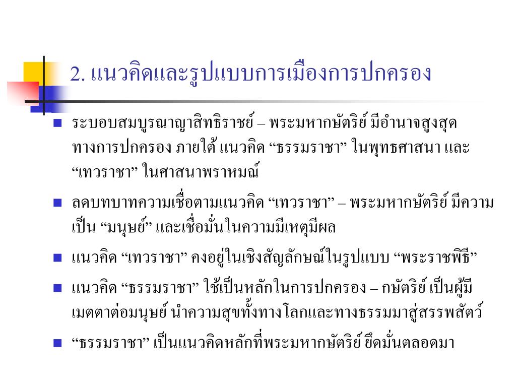 2. แนวคิดและรูปแบบการเมืองการปกครอง • ระบอบสมบูรณาญาสิทธิราชย์ – พระมหากษัตริย์ มีอำนาจสูงสุดทางการปกครอง ภายใต้ แนวคิด “ธรรมราชา” ในพุทธศาสนา และ “เทวราชา” ในศาสนาพราหมณ์ • ลดบทบาทความเชื่อตามแนวคิด “เทวราชา” – พระมหากษัตริย์ มีความเป็น “มนุษย์” และเชื่อมั่นในความมีเหตุมีผล • แนวคิด “เทวราชา” คงอยู่ในเชิงสัญลักษณ์ในรูปแบบ “พระราชพิธี” • แนวคิด “ธรรมราชา” ใช้เป็นหลักในการปกครอง – กษัตริย์ เป็นผู้มีเมตตาต่อมนุษย์ นำความสุขทั้งทางโลกและทางธรรมมาสู่สรรพสัตว์ • “ธรรมราชา” เป็นแนวคิดหลักที่พระมหากษัตริย์ ยึดมั่นตลอดมา