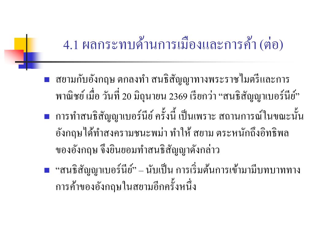 4.1 ผลกระทบด้านการเมืองและการค้า (ต่อ) • สยามกับอังกฤษ ตกลงทำ สนธิสัญญาทางพระราชไมตรีและการพาณิชย์ เมื่อ วันที่ 20 มิถุนายน 2369 เรียกว่า “สนธิสัญญาเบอร์นีย์” • การทำสนธิสัญญาเบอร์นีย์ ครั้งนี้ เป็นเพราะ สถานการณ์ในขณะนั้น อังกฤษได้ทำสงครามชนะพม่า ทำให้ สยาม ตระหนักถึงอิทธิพลของอังกฤษ จึงยินยอมทำสนธิสัญญาดังกล่าว • “สนธิสัญญาเบอร์นีย์” – นับเป็น การเริ่มต้นการเข้ามามีบทบาททางการค้าของอังกฤษในสยามอีกครั้งหนึ่ง