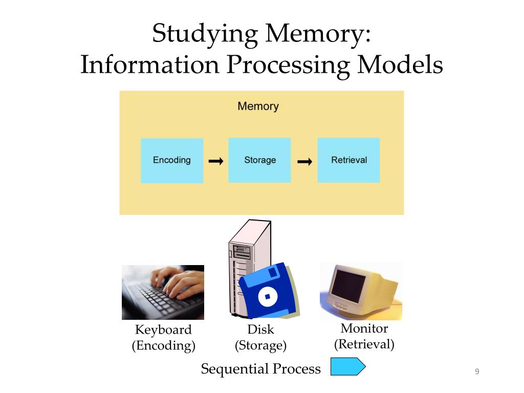 Studying Memory: Information Processing Models Monitor (Retrieval) Disk (Storage) Keyboard (Encoding) Sequential Process