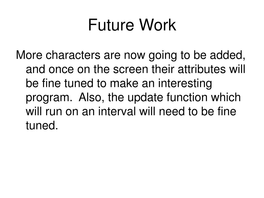 Future Work More characters are now going to be added, and once on the screen their attributes will be fine tuned to make an interesting program. Also, the update function which will run on an interval will need to be fine tuned.