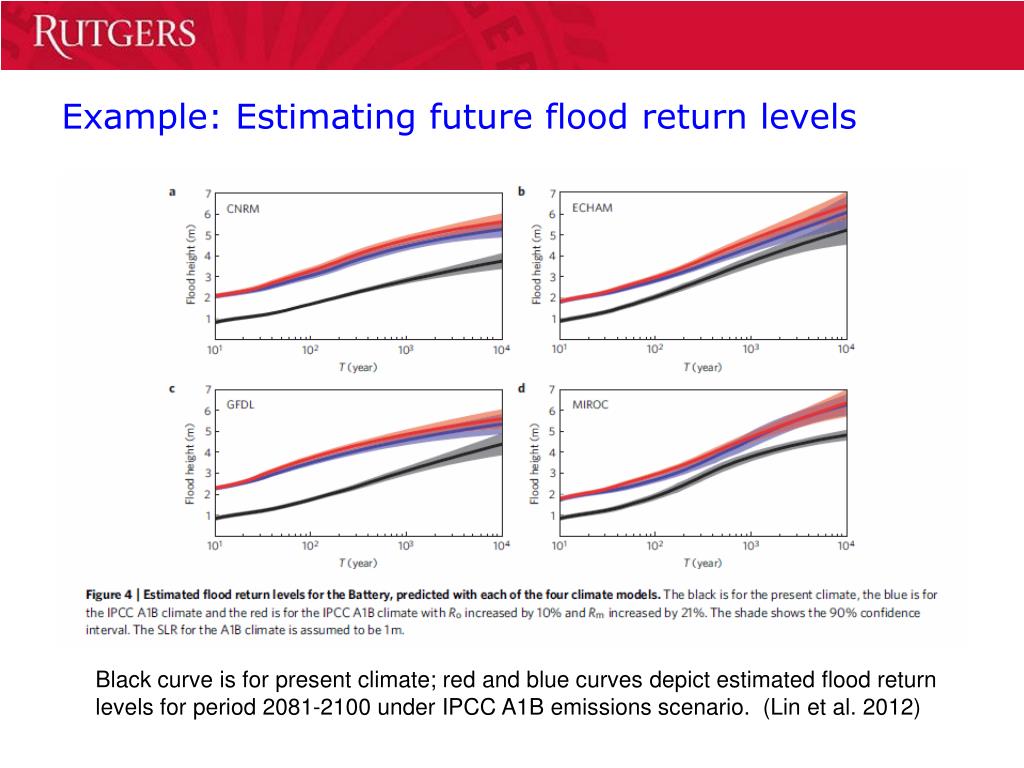 Example: Estimating future flood return levels Black curve is for present climate; red and blue curves depict estimated flood return levels for period 2081-2100 under IPCC A1B emissions scenario. (Lin et al. 2012)
